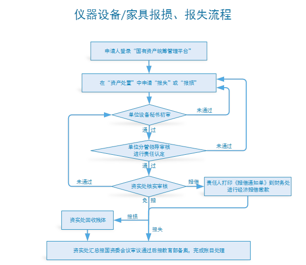 1.仪器设备、家具发生损坏、丢失,二级单位要查明原因,分清责任,提出处理意见,经单位决策,提交申请和证明材料至资实处。