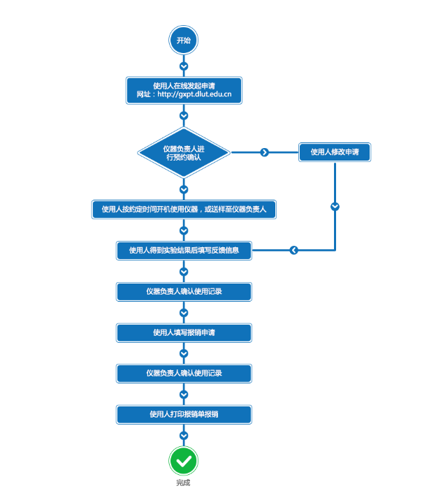 大型仪器设备开放共享分为送样委托测试和预约使用两种方式,两种方式均需通过共享系统填写预约申请,通过共享系统进行费用结算。预约使用开放的大型仪器设备还需按实体平台要求参加培训和考核,取得相应权限。