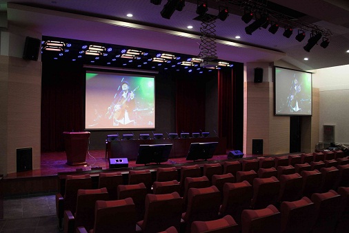 西校区综合教学2#楼报告厅的装修方案,经过校团委、学生处、资产处、设计单位反复论证,在满足会议、报告、学生活动等功能前提下,拿出了经济合理的设计方案。经过四个月的努力,在原有半装修的基础上,进行了较为全面的装修和基础设施配置:将原有控制间改扩成更为合理的演播室,墙体内部填充隔音棉形成吸音布墙,排椅布置科学合理,灯光配置根据要求的不同可随意调整,实现最优效果。