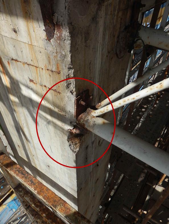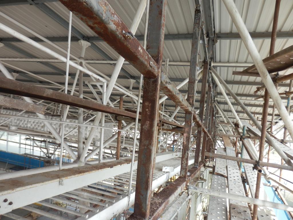 2、游泳馆幕墙钢支撑架及内部装修拆除后,施工监理发现以前封装在内部的屋顶网架柱头及钢桁架根部严重锈蚀(见照片)。