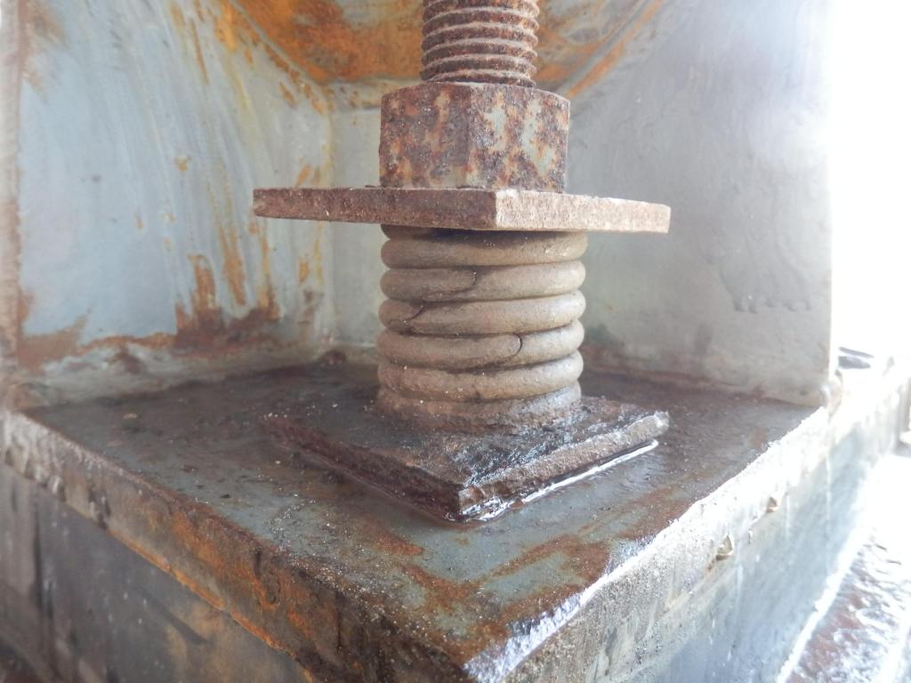 该螺栓的作用是将钢结构屋顶固定在结构柱上,弹簧的作用是减震。该螺栓及弹环影响整个屋顶网架的结构安全,需对30个柱头的120个螺栓的处理方案进行设计、论证。初步论证方案,仅需要更换螺帽、垫片及弹簧,螺杆除锈后重新套丝即可,但螺杆直径可能由30毫米减少至28毫米。该方案需要进一步确认螺杆直径减小后仍能满足结构要求,确认弹簧的材质及各项指标。现正联系原设计单位确认。希望螺杆仍能满足结构要求,否则更换螺杆将涉及整个游泳馆、训练馆的钢结构屋顶拆装。