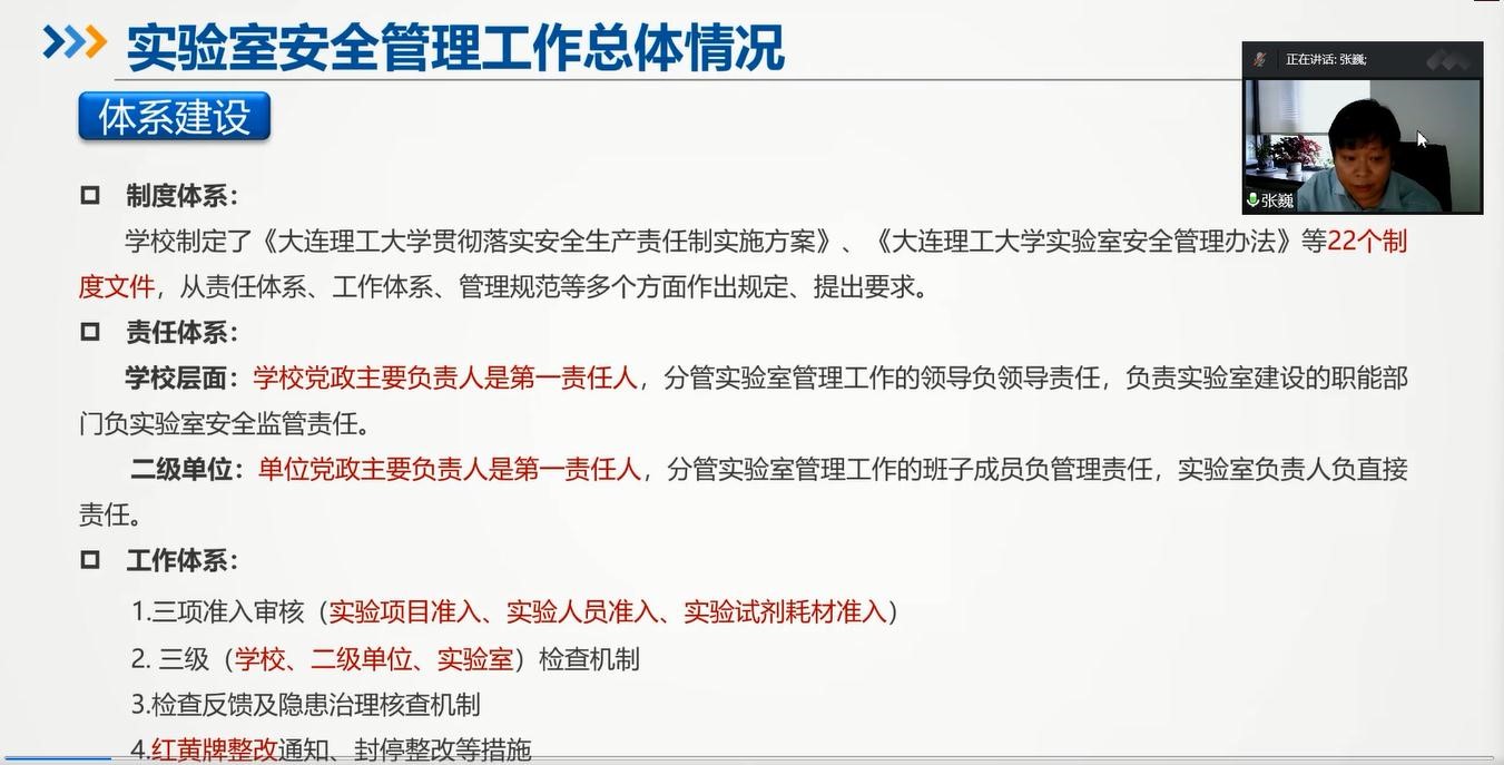 资产与实验室管理处处长张巍对学校2022年实验室安全管理情况作了通报,就教育部2022年高校实验室安全现场检查情况迎检准备工作进行了介绍,并结合学校实际对实验室安全隐患排查与治理做出了部署。