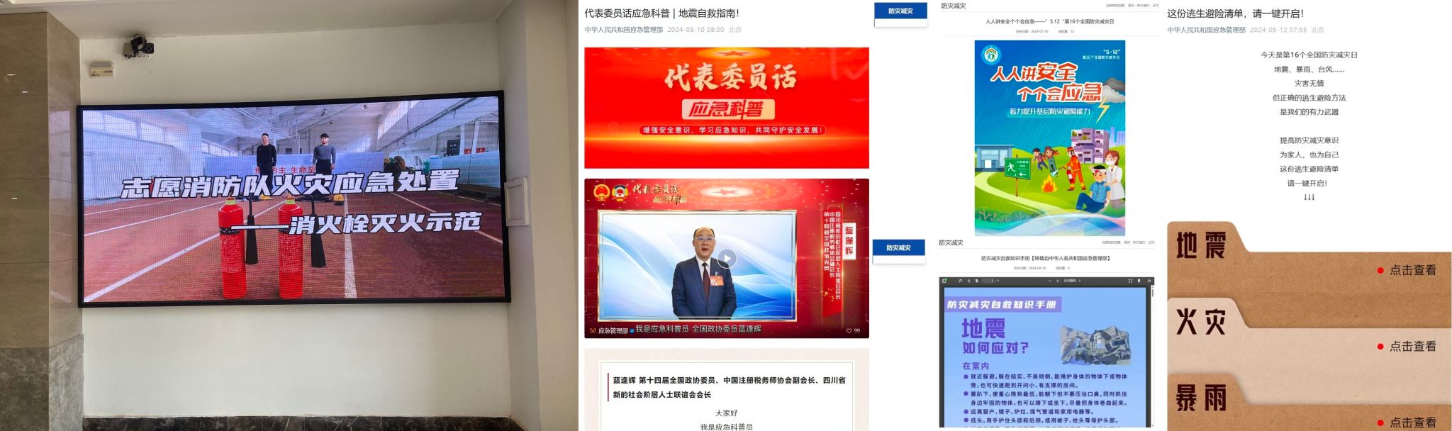 防灾减灾安全分委员会结合夏季特点,检查应急物资储备、防雷避雷设施,维修挡墙,清理死树枯枝,提高度汛防雷保障能力;开展以“人人讲安全、个个会应急——着力提升基层防灾避险能力”为主题的防灾减灾宣传活动,通过播放应急救援科普知识视频、连载防灾减灾专题知识以及防灾减灾宣传教育,提升师生防灾避险能力。