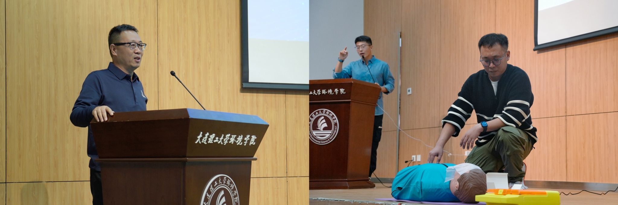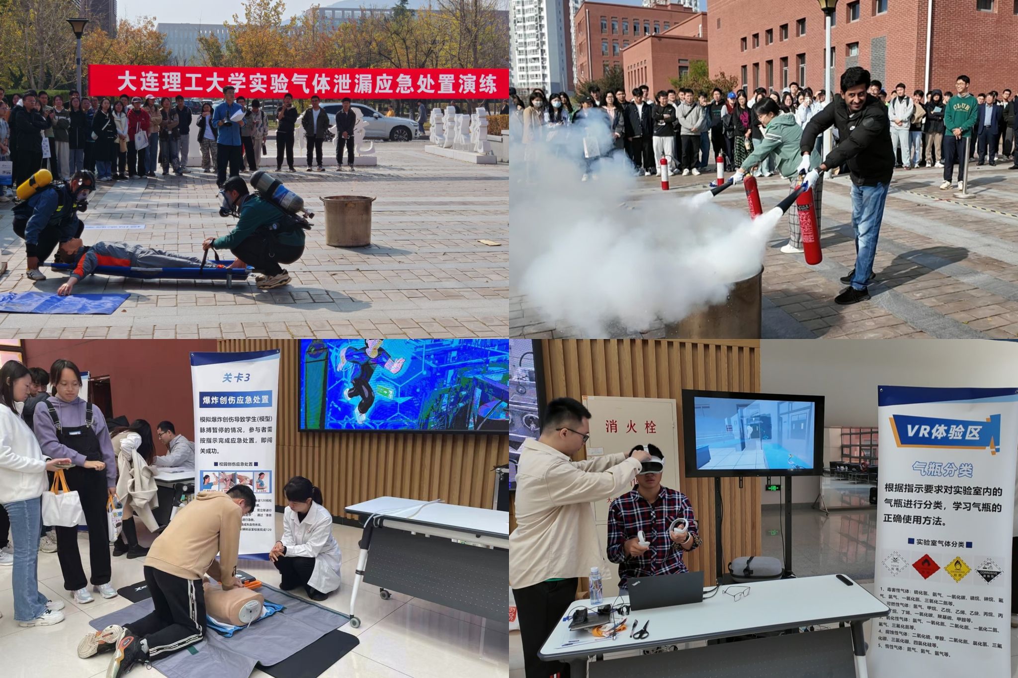 在活动中,大连大特气体有限公司专家以实验气瓶使用安全为例,结合事故案例,从合规购买、合理使用、风险管理、应急处置以及现场救援人员救治常用方法等方面进行了集中培训;以气瓶硫化氢泄漏为背景,按照应急处置预案,对事故发现、信息报告、疏散警戒、人员抢救、险情控制、现场善后等环节进行了模拟演练,并邀请现场师生参与灭火器、灭火毯、自动体外除颤器、心肺复苏术等常用设备和方法进行应用体验;同时,在知渊楼一楼展厅设置应急物品展示及用法讲解、安全与应急知识问答、心肺复苏术学习、VR体验等活动专区,辅助在场师生学习了解安全应急知识和技能。