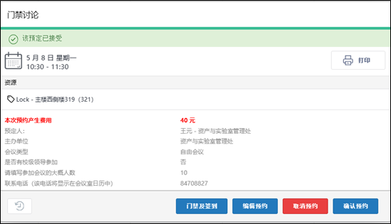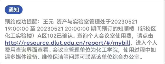 2.多媒体设备使用及维修保洁。预约成功后预约人将收到邮件及i大工消息提醒,显示所预约会议室的管理单位。