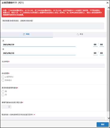 (2)预约界面中显示会议室的收费标准,预约后系统将根据预约时间计算并提示此次预约所产生的费用;