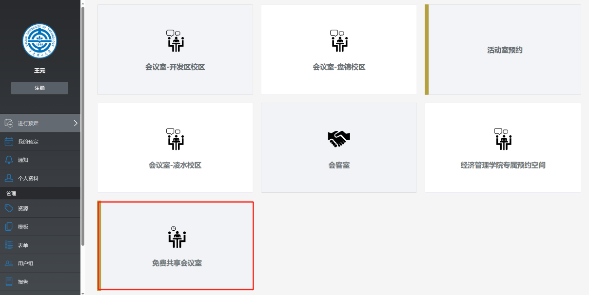 (1)校园门户→业务系统→公共资源信息平台→免费共享会议室→选择会议室;